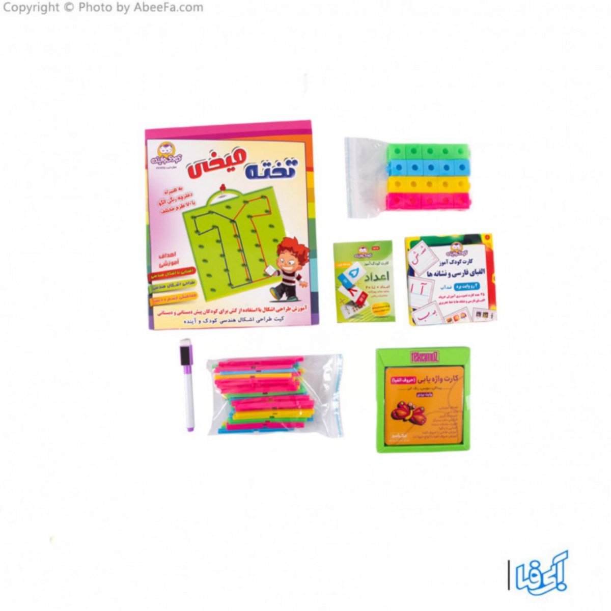 | محتویات بسته | حروف الفبا ,اعداد,تخته میخی,کیت طراحی اشکال هندسی |