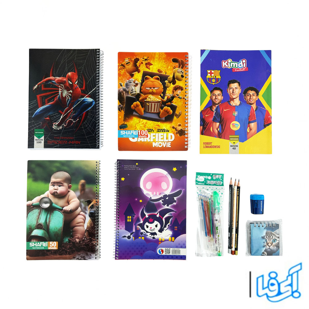 ست لوازم تحریر پسرانه 10عددی شامل دفتر، مداد، خودکار چندرنگ وهدیه ویژه. انتخابی کاربردی و شیک برای مدرسه و هدیه. خرید آنلاین از فروشگاه اینترنتی آبیفا.